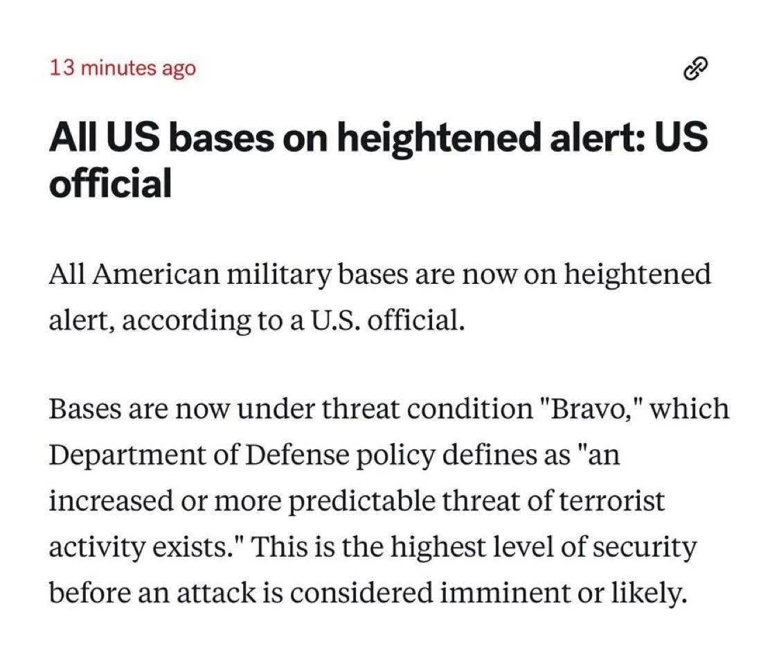 ÚLTIMA HORA: Todas las bases militares de EE. UU. se encuentran actualmente en estado de vigilancia reforzada, según un funcionario estadounidense.